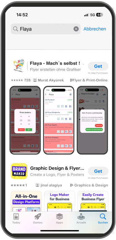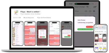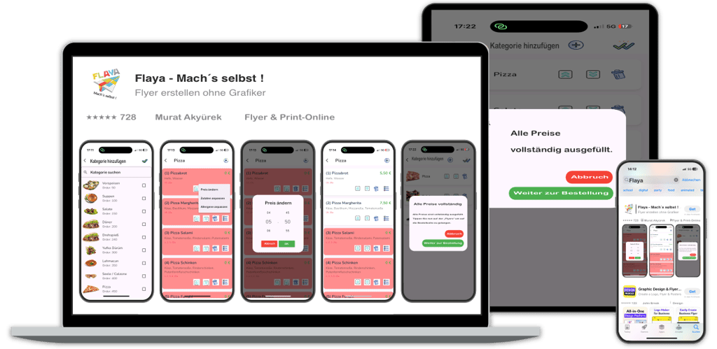 Um den Flyer zu vervollständigen musst Du nur noch deine Preise bestimmen indem Du auf die 0,00 Euro tippst und Deinen Preis eingibst. Wenn keine Preise hinterlegt sind, erscheint die Kategorie rot. Sobald ein Betrag eingegeben wurde, ist die Kategorie bzw. das Gericht weiss. Fertig und nächsten roten Balken anpassen.
